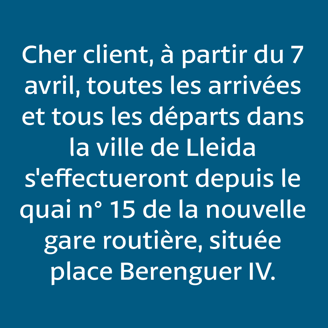 Avertissement dernière minute: Cher client, à partir du 7 avril, toutes les arrivées et tous les départs dans la ville de Lleida s'effectueront depuis le quai n° 15 de la nouvelle gare routière, située place Berenguer IV.